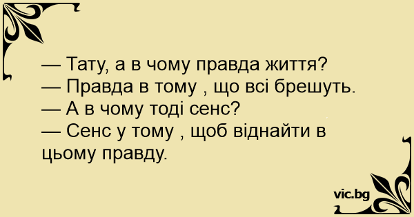 — Тату, а в чому правда життя? — Правда в тому , що всі брешуть. — А в чому тоді сенс? — Сенс у тому , щоб віднайти в цьому правду.