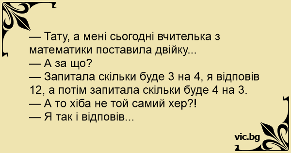 — Запитала скільки буде 3 на 4, я відповів 12, а потім запитала скільки буде 4 на 3.