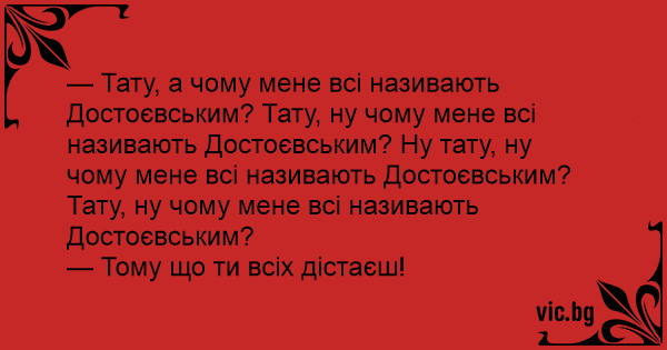 — Тату, а чому мене всі називають Достоєвським? Тату, ну чому мене всі називають Достоєвським? Ну тату, ну чому мене всі називають Достоєвським? Тату, ну чому мене всі називають Достоєвським?