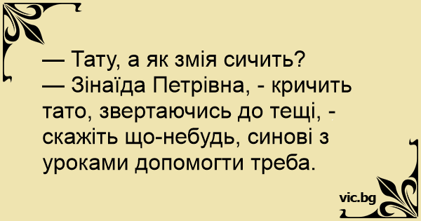 — Зінаїда Петрівна, - кричить тато, звертаючись до тещі, - скажіть що-небудь, синові з уроками допомогти треба.
