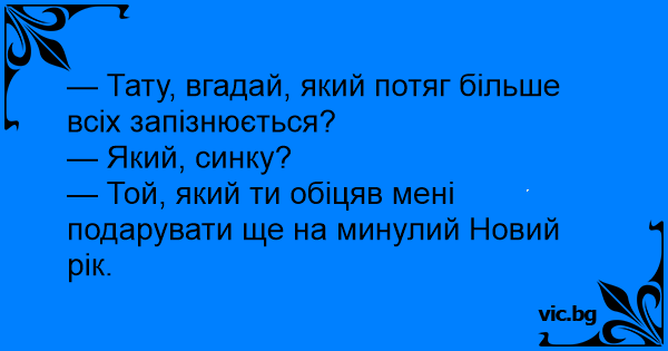 Petriukas klausia tėčio: - Tėti, atspėk, koks traukinys labiausiai vėluoja? - Eeee… Nežinau… O koks? - Tas, kurį beveik prieš metus žadėjai man padovanoti gimtadienio proga!