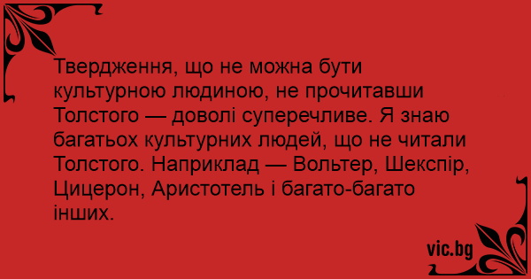 Твердження, що не можна бути культурною людиною, не прочитавши Толстого — доволі суперечливе. Я знаю багатьох культурних людей, що не читали Толстого. Наприклад — Вольтер, Шекспір, Цицерон, Аристотель і багато-багато інших.