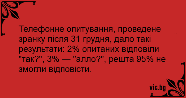 Телефонне опитування, проведене зранку після 31 грудня, дало такі результати: 2% опитаних відповіли "так?", 3% — "алло?", решта 95% не змогли відповісти.