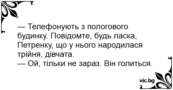 — Телефонують з пологового будинку. Повідомте, будь лaскa, Петренку, що у нього народилася трійня, дівчата.