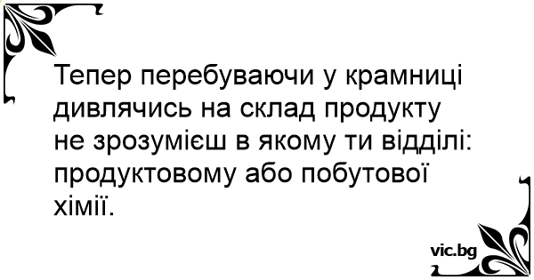Тепер перебуваючи у крамниці дивлячись на склад продукту не зрозумієш в якому ти відділі: продуктовому або побутової хімії.