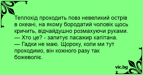 Теплохід проходить повз невеликий острів в океані, на якому бородатий чоловік щось кричить, відчайдушно розмахуючи руками.