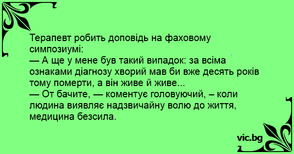 — А ще у мене був такий випадок: за всіма ознаками діагнозу хворий мав би вже десять років тому померти, а він живе й живе...