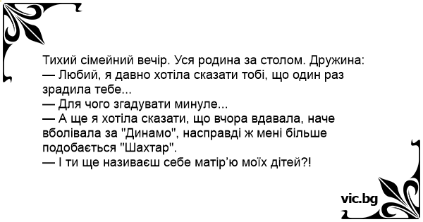 Тихий сімейний вечір. Уся родина за столом. Дружина: