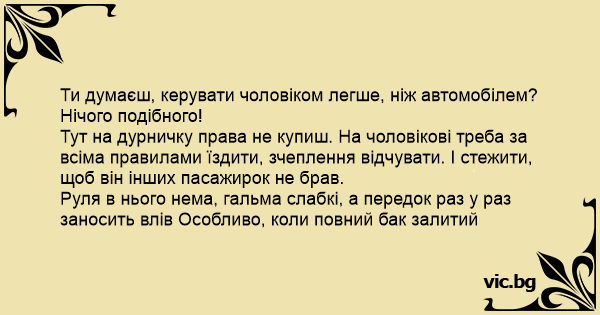 Тут на дурничку права не купиш. На чоловікові треба за всіма правилами їздити, зчеплення відчувати. І стежити, щоб він інших пасажирок не брав.