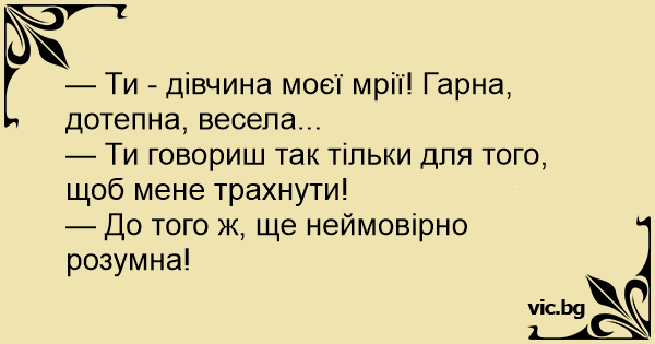 — Ты — девушка моей мечты! Красивая, остроумная, веселая... — Ты говоришь так только для того, чтобы меня трахнуть! — К тому же, еще невероятно умная!