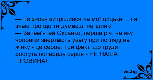 — Запам'ятай Оксанко, перша річ, на яку чоловіки звертають увагу при погляді на жінку - це серце. Той факт, що груди ростуть попереду серця - НЕ НАША ПРОВИНА!