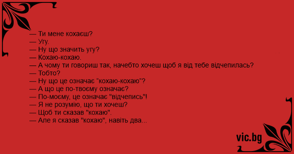 — Ну чому ти не можеш сказати просто "кохаю"? Навіщо додавати це "ну добре" щоб я від тебе відчепилася!