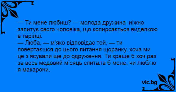 — Люба, — м’яко відповідає той, — ти повертаєшся до цього питання щоранку, хоча ми це з’ясували ще до одруження. Ти краще б хоч раз за весь медовий місяць спитала б мене, чи люблю я макарони.