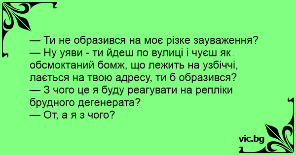 — Ну уяви - ти йдеш по вулиці і чуєш як обсмоктаний бомж, що лежить на узбіччі, лається на твою адресу, ти б образився?