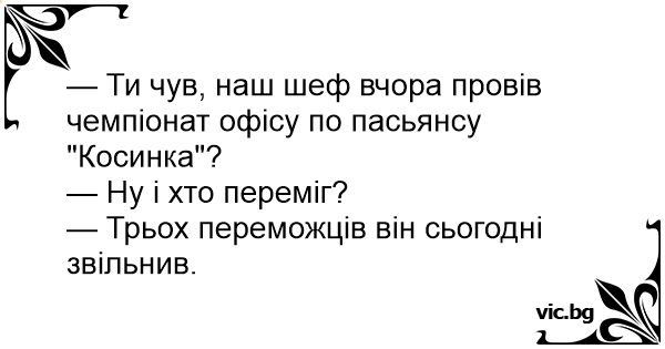 — Ти чув, наш шеф вчора провів чемпіонат офісу по пасьянсу "Косинка"?