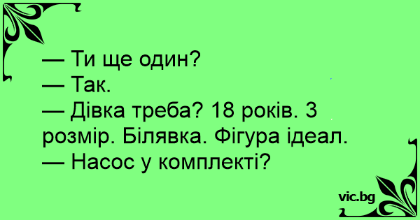 — Дівка треба? 18 років. 3 розмір. Білявка. Фігура ідеал.