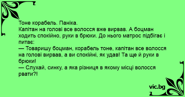 — Товаришу боцман, корабель тоне, капітан все волосся на голові вирвав, а ви спокійні, як удав! Та ще й руки в брюки!