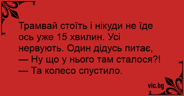 Трамвай стоїть і нікуди не їде ось уже 15 хвилин. Усі нервують. Один дідусь питає,