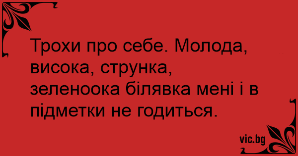 Трохи про себе. Молода, висока, струнка, зеленоока білявка мені і в підметки не годиться.