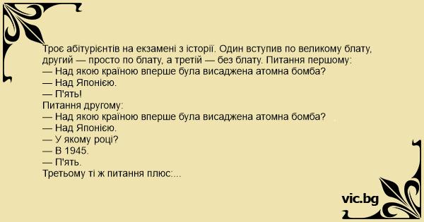 Троє абітурієнтів на екзамені з історії. Один вступив по великому блату, другий — просто по блату, а третій — без блату. Питання першому: