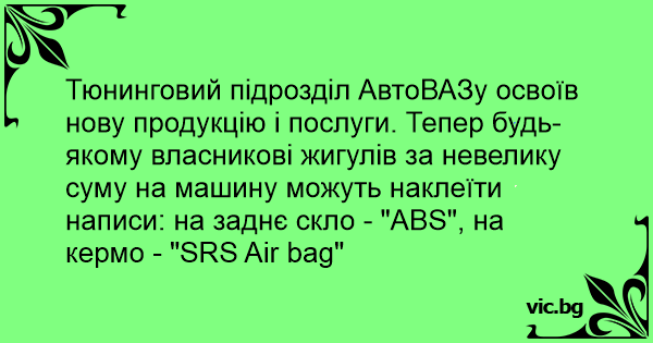 Тюнинговий підрозділ АвтоВАЗу освоїв нову продукцію і послуги. Тепер будь-якому власникові жигулів за невелику суму на машину можуть наклеїти написи: на заднє скло - "ABS", на кермо - "SRS Air bag"