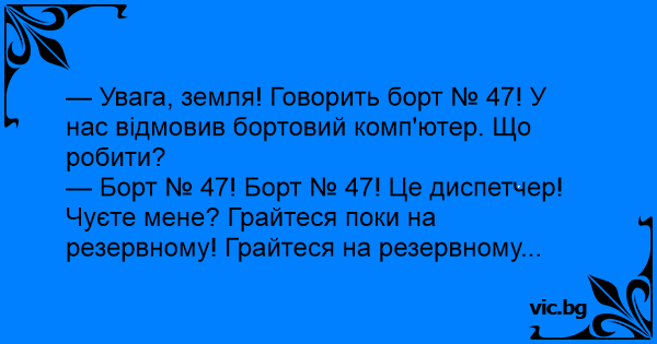 — Увага, земля! Говорить борт № 47! У нас відмовив бортовий комп'ютер. Що робити?