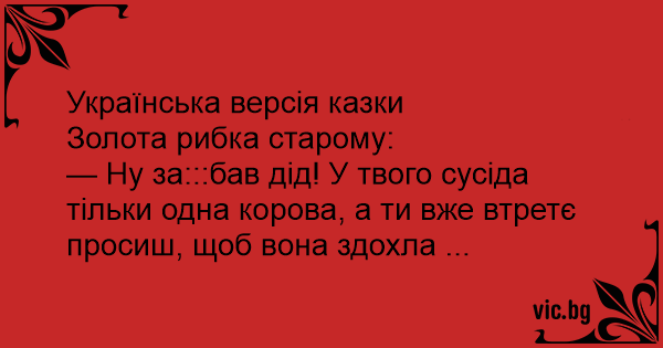— Ну за:::бав дід! У твого сусіда тільки одна корова, а ти вже втретє просиш, щоб вона здохла ...