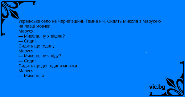 Українське село на Чернігівщині. Темна ніч. Сидять Микола з Марусею на лавці мовчки.