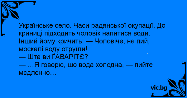 Інший йому кричить: — Чоловіче, не пий, москалі воду отруїли!
