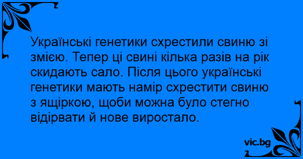 Українські генетики схрестили свиню зі змією. Тепер ці свині кілька разів на рік скидають сало. Після цього українські генетики мають намір схрестити свиню з ящіркою, щоби можна було стегно відірвати й нове виростало.