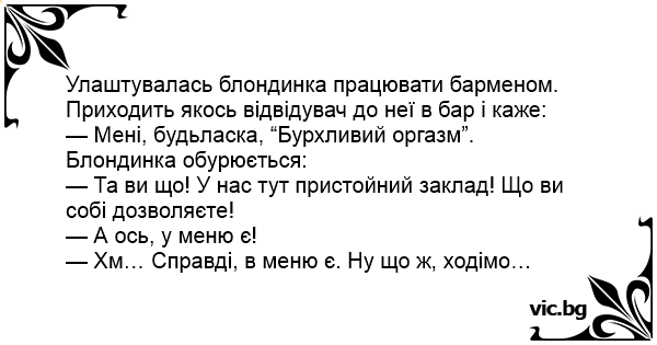 Улаштувалась блондинка працювати барменом. Приходить якось відвідувач до неї в бар і каже: