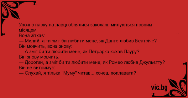 — Милий, а ти зміг би любити мене, як Данте любив Беатріче?
