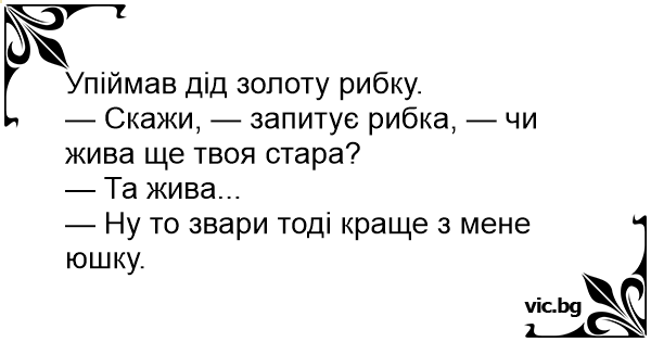 — Скажи, — запитує рибка, — чи жива ще твоя стара?