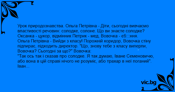 Урок природознавства. Ольга Петрівна - Діти, сьогодні вивчаємо властивості речовин: солодке, солоне. Що ви знаєте солодке? Оксанка - цукор, відмінник Петрик - мед, Вовочка - єб:::ння.