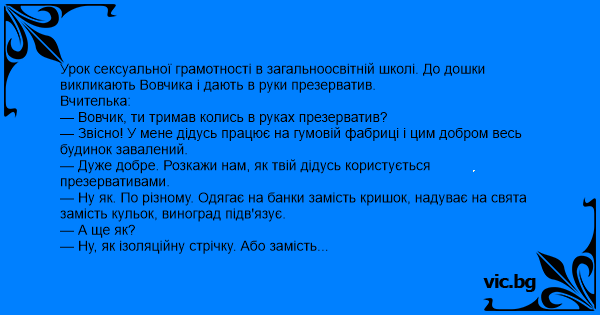 Урок сексуальної грамотності в загальноосвітній школі. До дошки викликають Вовчика і дають в руки пpeзepbatиb.