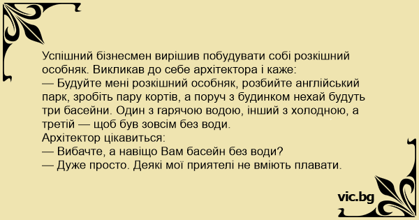 — Будуйте мені розкішний особняк, розбийте англійський парк, зробіть пару кортів, а поруч з будинком нехай будуть три басейни. Один з гарячою водою, інший з холодною, а третій — щоб був зовсім без води.