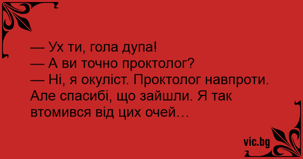 — Ні, я окуліст. Проктолог навпроти. Але спасибі, що зайшли. Я так втомився від цих очей…