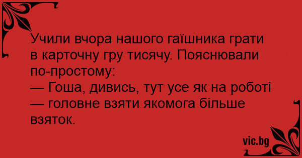 — Гоша, дивись, тут усе як на роботі — головне взяти якомога більше взяток.