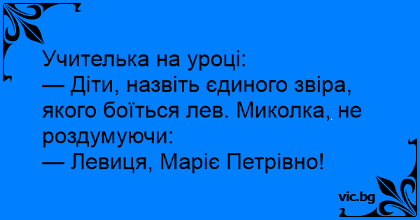 — Діти, назвіть єдиного звіра, якого боїться лев. Миколка, не роздумуючи: