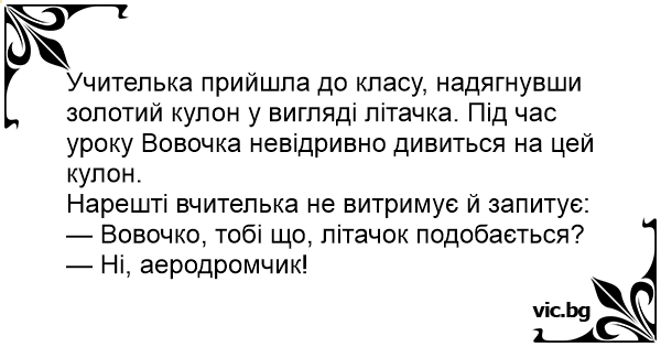 Учителька прийшла до класу, надягнувши золотий кулон у вигляді літачка. Під час уроку Вовочка невідривно дивиться на цей кулон.