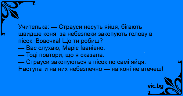 Учителька: — Страуси несуть яйця, бігають швидше коня, за небезпеки закопують голову в пісок. Вовочка! Що ти робиш?