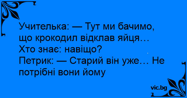 Учителька: — Тут ми бачимо, що крокодил відклав яйця… Хто знає: навіщо?