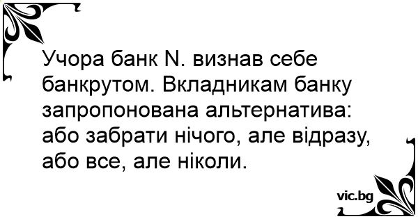 Учора банк N. визнав себе банкрутом. Вкладникам банку запропонована альтернатива: або забрати нічого, але відразу, або все, але ніколи.