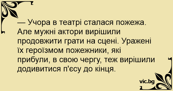 — Учора в театрі сталася пожежа. Але мужні актори вирішили продовжити грати на сцені. Уражені їх героїзмом пожежники, які прибули, в свою чергу, теж вирішили додивитися п'єсу до кінця.