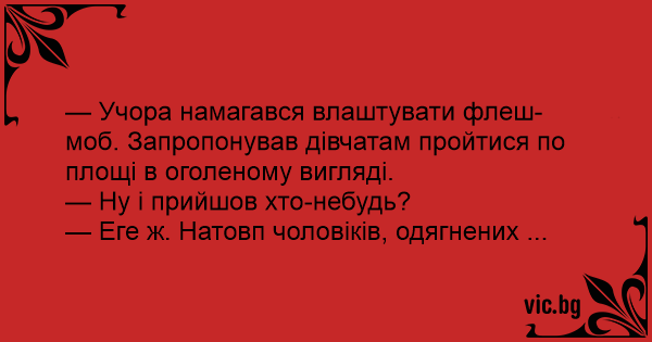 — Учора намагався влаштувати флеш-моб. Запропонував дівчатам пройтися по площі в оголеному вигляді.