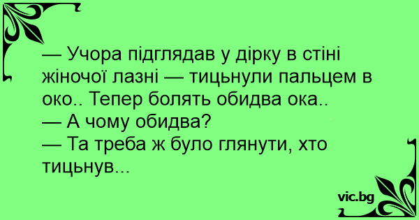 — Учора підглядав у дірку в стіні жіночої лазні — тицьнули пальцем в око.. Тепер болять обидва ока..