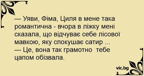 — Уяви, Фіма, Циля в мене така романтична - вчора в ліжку мені сказала, що відчуває себе лісової мавкою, яку спокушає сатир ...
