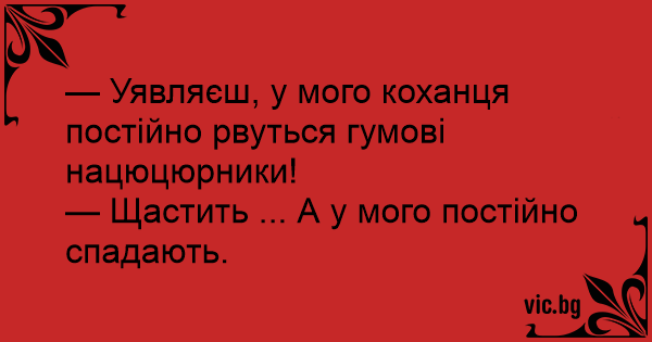 — Уявляєш, у мого коханця постійно рвуться гумові нацюцюрники!