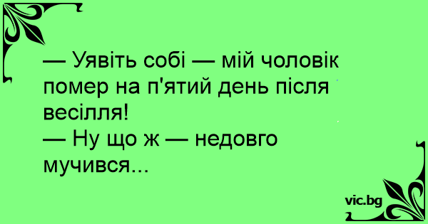 — Уявіть собі — мій чоловік помер на п'ятий день після весілля!