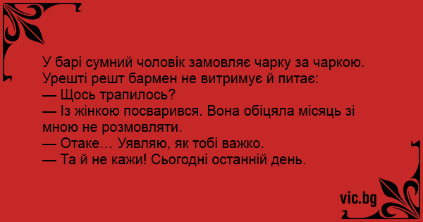 У барі сумний чоловік замовляє чарку за чаркою. Урешті решт бармен не витримує й питає: